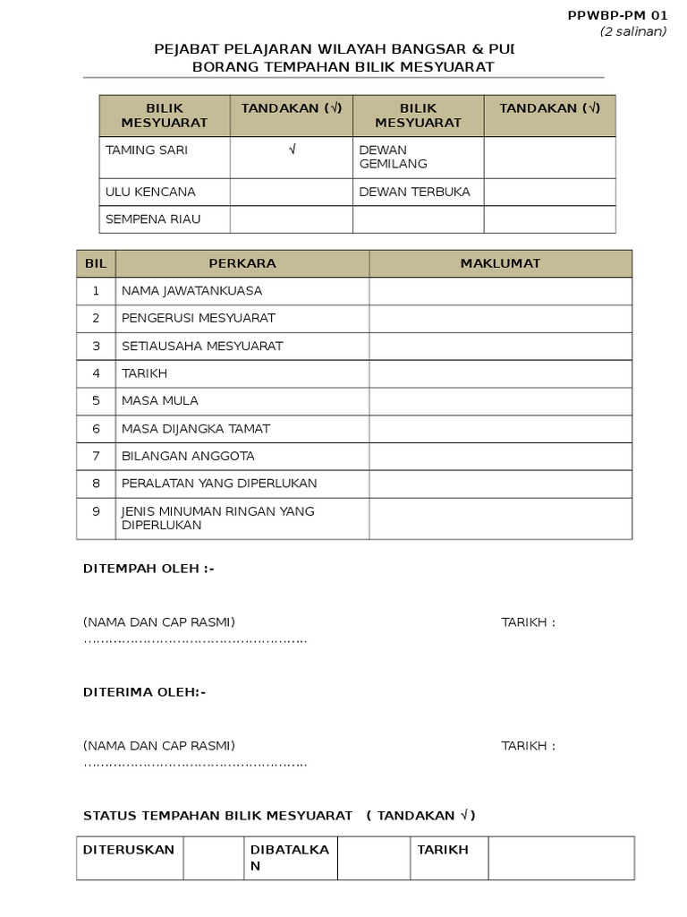 Bilik mesyuarat sudr (aras 9) 4) nota : Permohonan awal akan diberi keutamaan. More images for borang tempahan bilik mesyuarat » Permohonan melalui telefon tidak akan dilayan. View borang_tempahan_bilik_mesyuarat_5.pdf from bpp 7012 at kolej vokasional sungai petani 2.